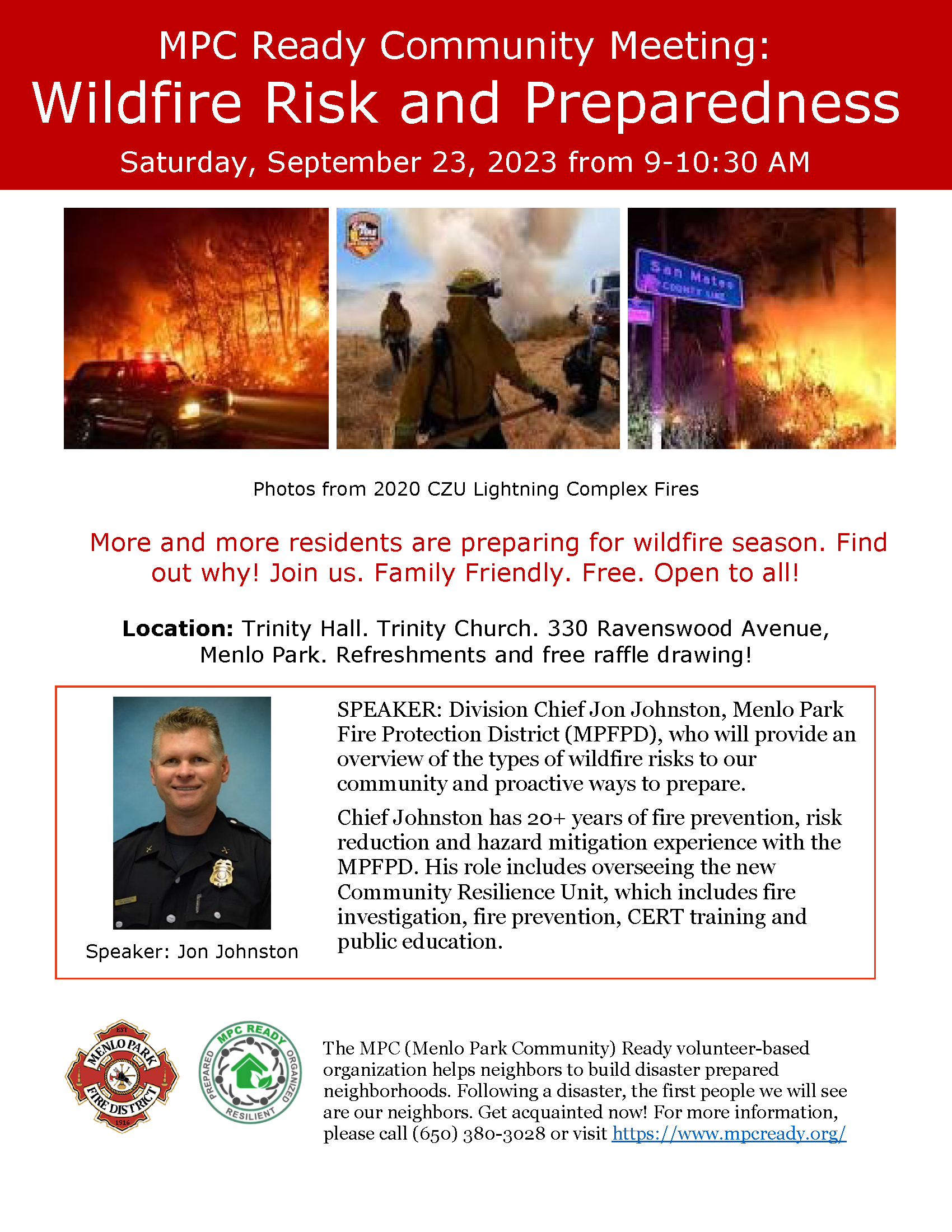 « All Events This event has passed. MPC Ready Community Meeting: Wildfire Risk and Preparedness September 23, 2023 « Fire Safe Sonoma Speaker Series 22 D-Space Award Webinar » Add to calendar Google Calendar iCalendar Outlook 365 Outlook Live Details Date: September 23, 2023 Event Category: Partner Events