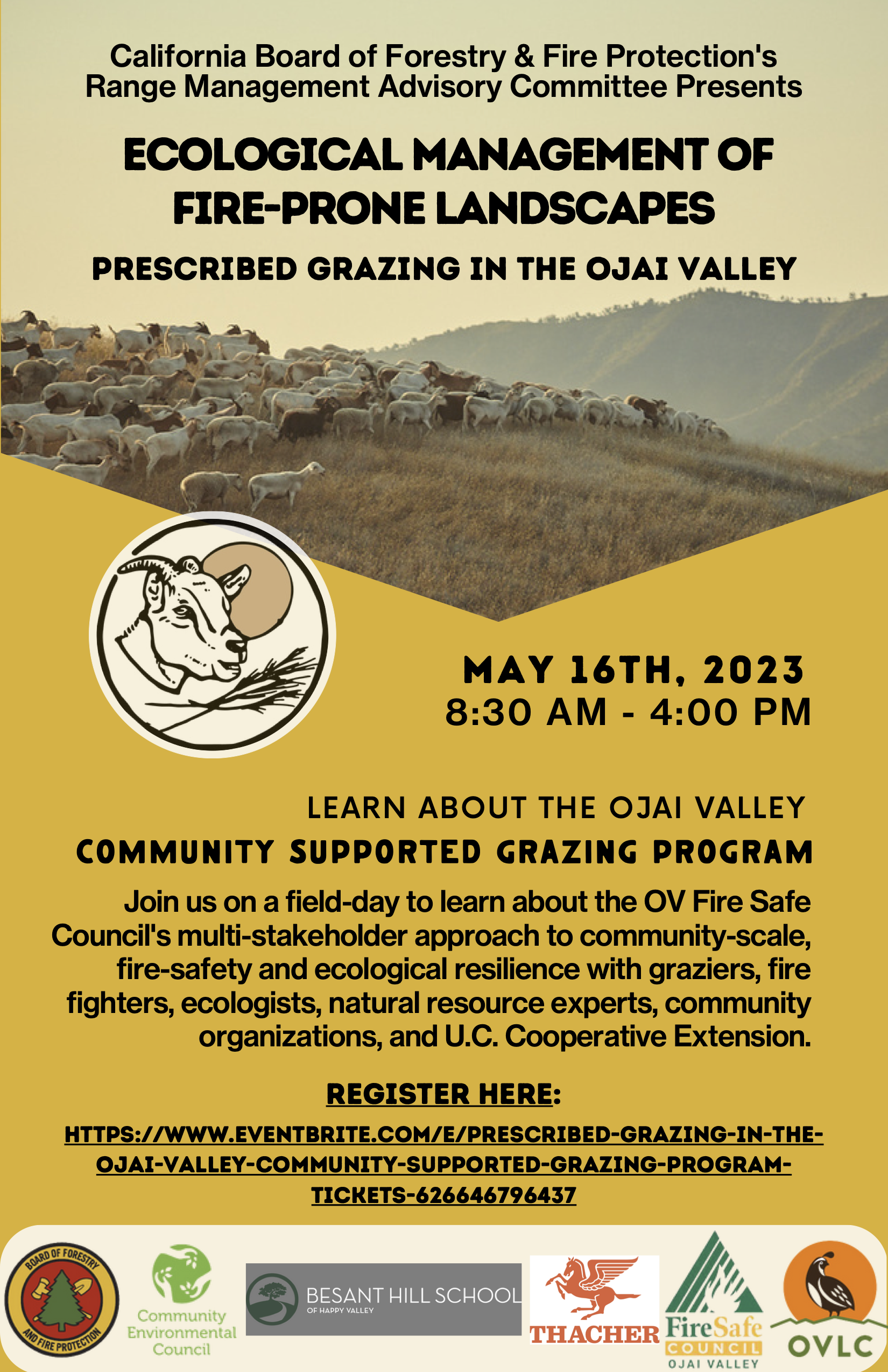 “Join us on a field-day to learn about the Ojai Valley Fire Safe Council’s multi-stakeholder approach to community-scale, fire-safety and ecological resilience with graziers, fire fighters, ecologists, natural resource experts, community organizations, and U.C. Cooperative Extension. Owner-operators of Shepherdess Land & Livestock and Ventura Brush Goats will walk participants through the ins and outs of planning grazing in complex wildfire-urban landscapes, with demonstrations at the Besant School of Happy Valley and the Thacher School, where grazing with sheep and goats is being utilized to manage fuel loads and fire risk in these high-risk communities.