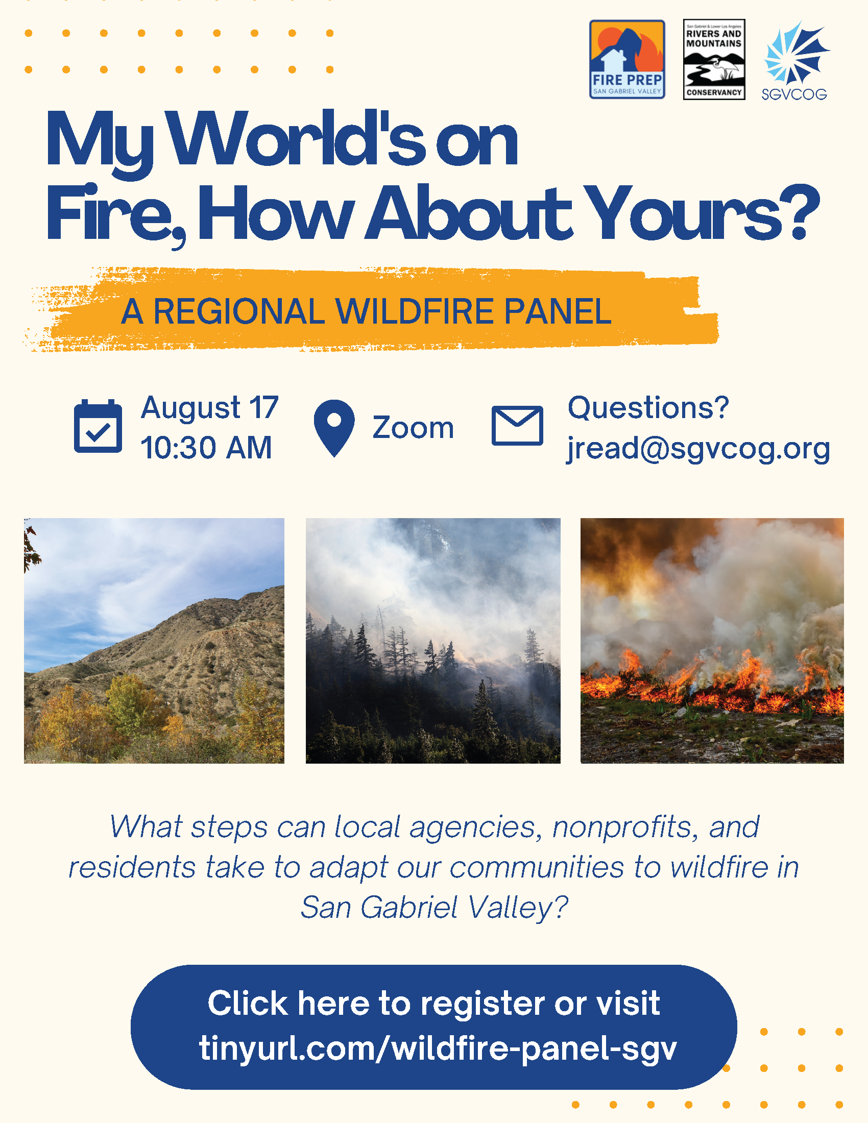 « All Events This event has passed. Regional Wildfire Panel: My World s on Fire, How About Yours? August 17, 2023 « Ventura County Firewise Workshop Wildfire-Ready Workshop, Ventura Regional Fire Safe Council » Add to calendar Google Calendar iCalendar Outlook 365 Outlook Live Details Date: August 17, 2023 Event Category: Partner Events