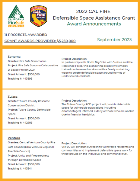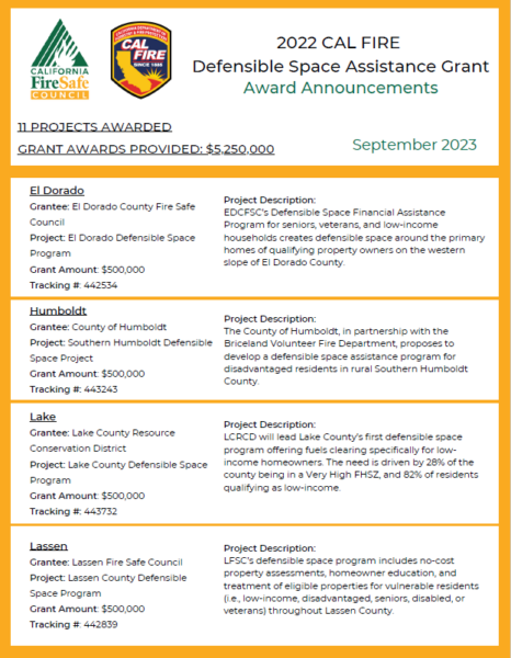 California Fire Safe Council (CFSC) is pleased to announce that eleven (11) organizations have been selected to receive grant awards for defensible space assistance projects. With funding from a 2022 CAL FIRE master grant, the CFSC will award more than $5 million to these applicants through the Defensible Space Assistance Grant Program.