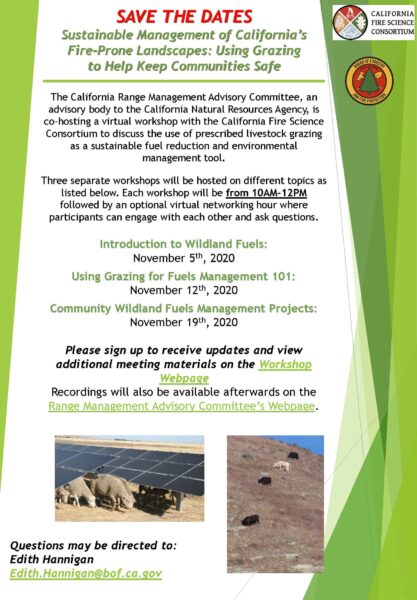 All Events & News SAVE THE DATES! Virtual Workshops discussing GRAZING as an alternative fuel reduction tool Published on September 30, 2020 By Felicia Dunn Download the PDF Here